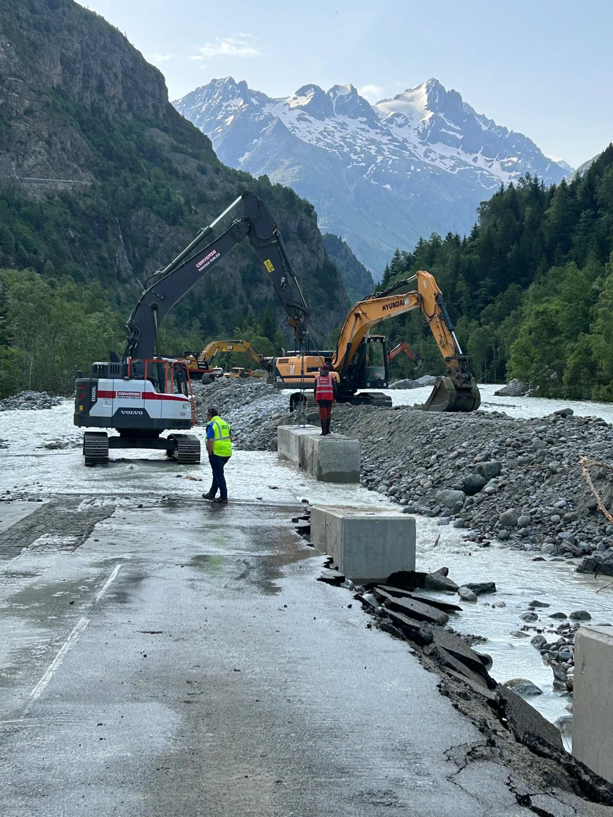 Intervention en urgence pour la réalisation de travaux de terrassement et enrochements secs et bétonnés sur plusieurs kilomètres afin de soutenir la route suite aux inondations du Vénéon de juin 2024.